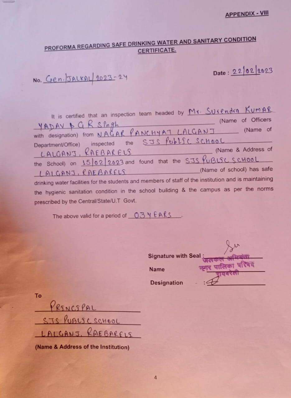 | 4 | COMPLETE ADDRESS WITH PIN CODE | SJS PUBLIC SCHOOL LALGANJ, RAEBARELI - KANPUR STATE HIGHWAY, NEAR LALGANJ FILLING STATION LALGANJ, RAEBARELI, UTTAR PRADESH -229208 |
